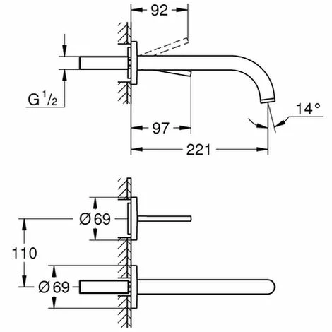 GROHE Atrio 2-Loch-Waschtischbatterie Wandmontage (ohne Unterputz-Einbaukörper) Fertigmontageset für 23 429 GROHE StarLight Oberfläche GROHE EcoJoy 5,7 l/min Laminar Mousseur Stichmaß 110 mm Ausladung 221 mm warm sunset