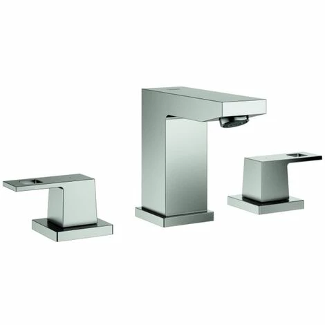 GROHE Eurocube 3-Loch-Waschtischbatterie, DN 15 Keramik-Oberteile 1/2”, 90 Grad GROHE StarLight Oberfläche GROHE QuickFix Plus Schnellbefestigungssystem Auslauf mit Mousseur Zugstangen-Ablaufgarnitur 1 1/4” druckfeste, flexible Verbindungsschläuche zw