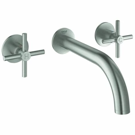 GROHE Atrio 3-Loch-Waschtischbatterie Wandmontage (ohne Unterputz-Einbaukörper) Fertigmontageset für 29 025 Keramik-Oberteile 1/2”, 90 Grad GROHE StarLight Oberfläche GROHE EcoJoy 5,7 l/min Laminar Mousseur Stichmaß 200 mm Ausladung 180 mm mit Kreuzg