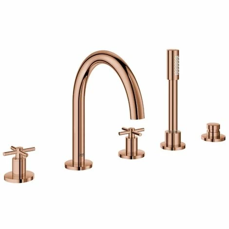 GROHE Atrio 5-Loch-Wannen-Kombination Keramik-Oberteile 1/2”, 90 Grad GROHE StarLight Oberfläche bestehend aus: Auslauf-Aufnahme vormontiert mit Kreuzgriffen Wanneneinlauf mit Mousseur Umstellung Wanne/Brause Sena Handbrause 6,6 l/min Brauseschlauch 2.0