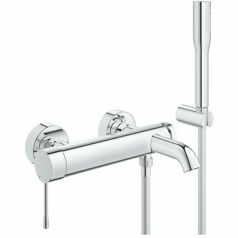 GROHE Essence Einhand-Wannenbatterie, DN 15 Wandmontage GROHE SilkMove 35 mm Keramikkartusche mit Temperaturbegrenzer GROHE StarLight Oberfläche automatische Umstellung: Wanne/Brause Auslauf mit Mousseur Brauseabgang unten 1/2” integrierter Rückflussverhinderer S-Anschlüsse Eigensicher gegen Rückfließen mit Brausegarnitur Euphoria Cosmopolitan Stick (27 367) Handbrausehalter Tempesta 100 C (27 594) Brauseschlauch Silverflex 1.500 mm (28 364) Professional Edition