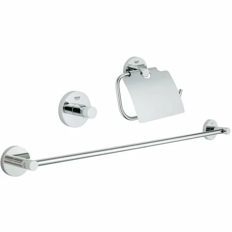 Das GROHE Essentials Accessoires-Set fürs Gästebad – harmonischer Stil und Komfort. Ein stylisches und rundum harmonisches Badezimmer-Design schaffen Sie mit dem Drei-in-Eins GROHE Essentials Accessoires-Set. In Deutschland konzipiert für den lebenslangen Einsatz, das Set umfasst einen Bademantelhaken, einen Toilettenpapierhalter (mit Abdeckung) und einen 600-mm-Handtuchhalter. Jedes Teil verfügt über die langlebige, pflegeleichte GROHE StarLight Chromoberfläche, die auch nach Jahren nicht an Glanz verliert. Außerdem ist die Montage ein Leichtes – befolgen Sie einfach die eindeutigen Schrittanleitungen. Sehen Sie sich auch die anderen Produkte unserer umfangreichen Kollektion an, wie zum Beispiel die Toilettenbürstengarnitur und zahlreiche weitere Handtuchhalter und Wannengriffe. GROHE Essentials Zubehör – präzise Handwerkskunst, hochwertigste Materialien und zeitloser Stil. Der elegante und komfortable letzte Schliff für alle Badezimmer.Farbe: chromMaterial: MetallBadetuchhalter: 60