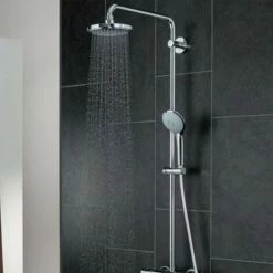 Betreten Sie Ihre mit dem GROHE Euphoria 180 Duschsystem mit Thermostat ausgestattete Dusche und erleben Sie totale Entspannung oder auch totale Belebung. Die vielseitigen Funktionen dieser Dusche lassen Ihnen die Wahl. Die Euphoria Cosmopolitan 180 mm Kopfbrause lässt Sie unter dem Rain Strahl entspannen. GROHE DreamSpray stellt einen gleichmäßigen Wasserfluss aus jeder Düse sicher. Der Duscharm der Kopfbrause ist um 180° schwenkbar – für mehr Flexibilität. Die Euphoria 110 mm-Massage-Handbrause verfügt über drei verschiedene Strahlbilder passend für jede Stimmung: einen sanften Rain Strahl, den umweltfreundlichen SmartRain und einen belebenden Massage Strahl.