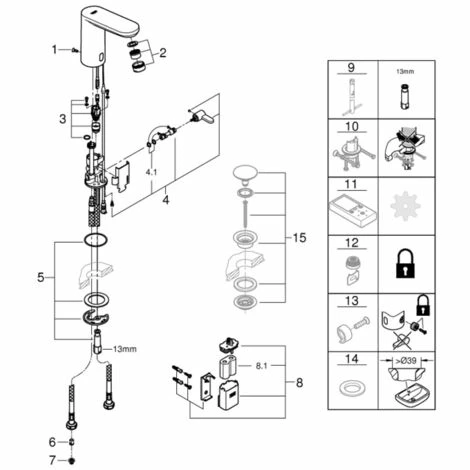 GROHE Eurosmart CE Infrarot-Elektronik für Waschtisch DN 15 mit Mischung und variabel einstellbarem Temperaturbegrenzer mit Infrarot-Sensor für bidirektionale Kommunikation 6 V Lithium-Batterie, Typ CR-P2 Batterielebensdauer ca. 7 Jahre (bei 150 Betätigungen pro Tag) GROHE StarLight Oberfläche GROHE EcoJoy 5,7 l/min Mousseur flexible Anschlussschläuche Rückflussverhinderer, Schmutzfangsiebe mit integriertem Magnetventil, Batterie extern Schnell-Montage-System mehrstufige Batteriezustandsanzeige 7 voreingestellte Programme automatische Spülung, thermische Desinfektion, Reinigungsmodus zusätzliche Funktionen und Einstellungen mit Fernbedienung 36 407 CE-Zeichen Armaturengruppe I nach DIN 4109 Schutzart Armatur IP 59K