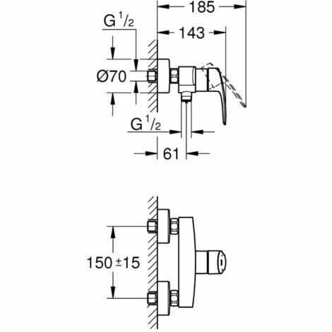 GROHE Eurosmart Einhand-Brausebatterie, DN 15 Wandmontage Bedienungshebel aus Metall GROHE SilkMove 35 mm Keramikkartusche variabel einstellbare Mengenbegrenzung mit Temperaturbegrenzer GROHE StarLight Oberfläche Brauseabgang unten 1/2” mit integriertem Rückflussverhinderer S-Anschlüsse Wandrosetten aus Metall Eigensicher gegen Rückfließen Professional Edition