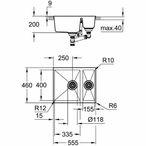 - 1 Becken: 335 x 400 x 200 mm