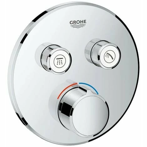 GROHE SmartControl Unterputzmischer mit 2 Absperrventilen Fertigmontageset für Rapido SmartBox (35 600/35 604) Wandrosette aus Metall mit GROHE FastFixation mit verdeckter Rosetten- und Schaftabdichtung, verdeckte Befestigung, nachträglich 6 Grad ausrichtbar GROHE StarLight Oberfläche SmartControl: An/Aus per Knopfdruck und Volumensteuerung durch Drehen auswechselbare Symbole Kartusche für Temperaturmischung gleichzeitige Nutzung mehrerer Verbraucher ohne Rohbau-Set Durchfluss: Abgang B = 23l/min, Abgang C = 25 l/min, Abgang B + C = 27 l/min
