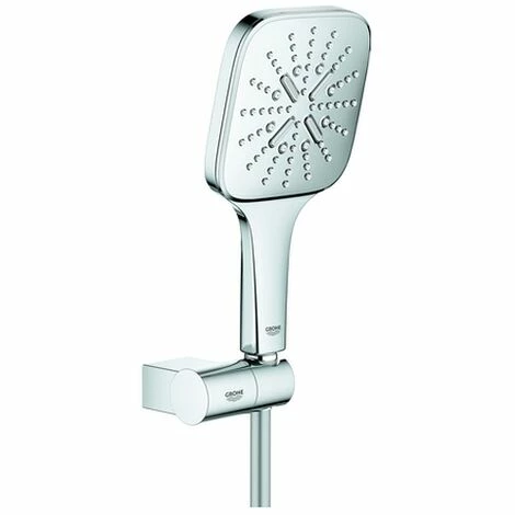 GROHE Rainshower SmartActive 130 Cube Wandhalterset 3 Strahlarten bestehend aus: Handbrause Rainshower SmartActive 130 Cube (26 582) Wandbrausehalter, verstellbar (27 056) Brauseschlauch Silverflex 1.500 mm (28 364) GROHE EcoJoy 9,5 l/min Durchflusskonsta